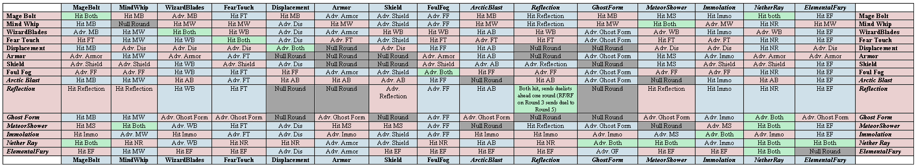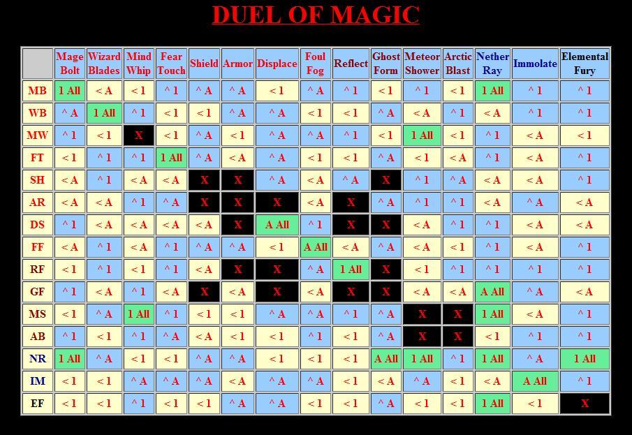 MB - Magebolt MW - Mind Whip WB - Wizard Blades FT - Fear Touch FF - Foul Fog AR - Armor SH - Shield DS - Displacement MS - Meteor Shower AB - Arctic Blast RF - Reflection GF - Ghostform IM - Immolation NR - Nether Ray EF - Elemental Fury |